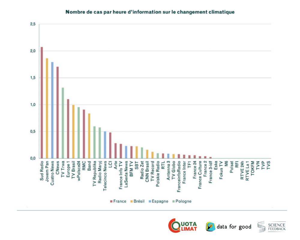 - 14 médias diffusent plus d’un cas de désinformation toutes les deux heures de temps d’antenne consacrés aux enjeux environnementaux : Sud Radio, Jovem Pan, Cuatro News, CNEWS, TV Trwa, Europe 1, TV Brazil, wPolsce24, RMC, Band, TV Republika, Radio Maryj, Telecinco NEWS et LCI.