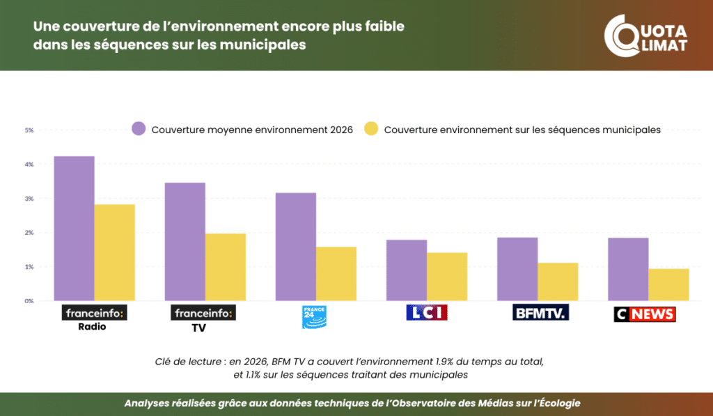 - 2,3% de temps d’antenne dédié à l’environnement, versus 4,4% en moyenne sur 2026, pour les chaînes généralistes