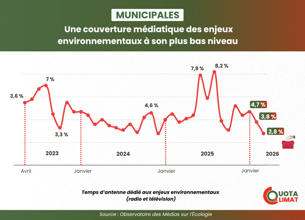Entre janvier et mars 2026, dans la dernière ligne droite de la campagne des élections municipales, la couverture des enjeux environnementaux n’a cessé de reculer dans l’ensemble des médias, selon les données de l’Observatoire des Médias sur l’Écologie analysées par QuotaClimat.