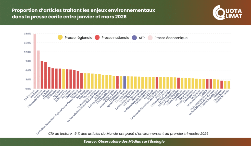 Dans la presse nationale se démarquent depuis le début de 2026 : Le Monde (9%), L’Humanité Dimanche (8,6%), ayant la proportion d’articles environnement la plus importante pendant la période, après les titres de presse économique comme La Tribune (17,7%) et Les Echos (12,4%). Dans la presse régionale : La Provence (6,4%), Nice Matin (5,0%) et Sud-Ouest (5,0%) sont en tête.