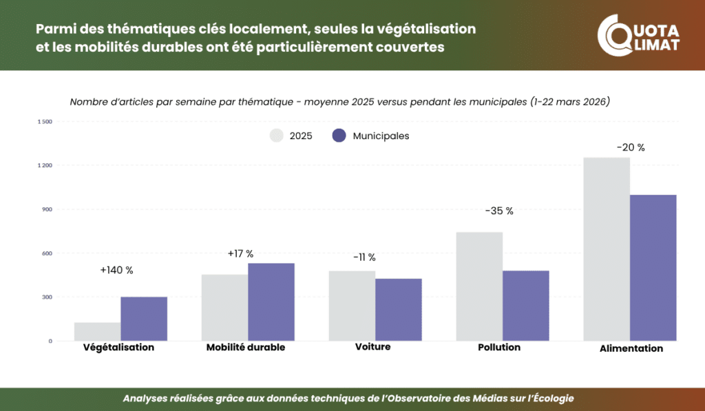 Les mobilités durables (transport en commun, vélo…), enjeu incontournable des élections municipales, ont bénéficié également d’une bonne exposition : les articles consacrés au sujet ont progressé de 17 % par rapport à la moyenne 2025.