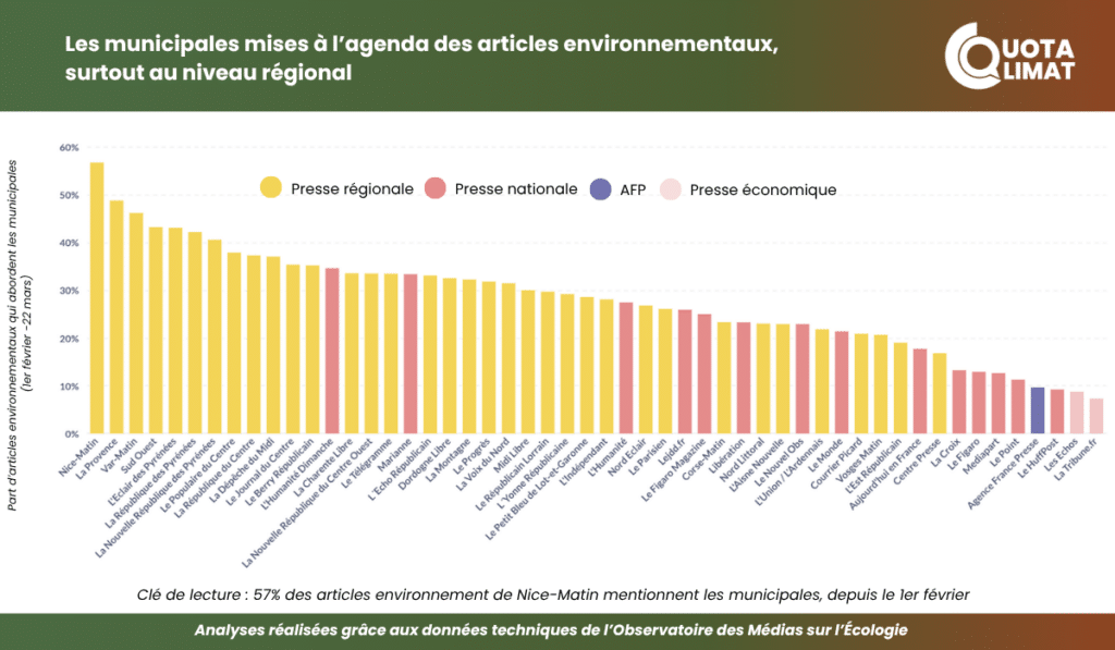 La presse régionale est par ailleurs celle qui, dans les articles parlant d’environnement, fait plus le lien avec les élections municipales : Nice-Matin, La Provence et Var-Matin se démarquent sur cette question, suivis de Sud-Ouest et l’Eclair des Pyrénées.