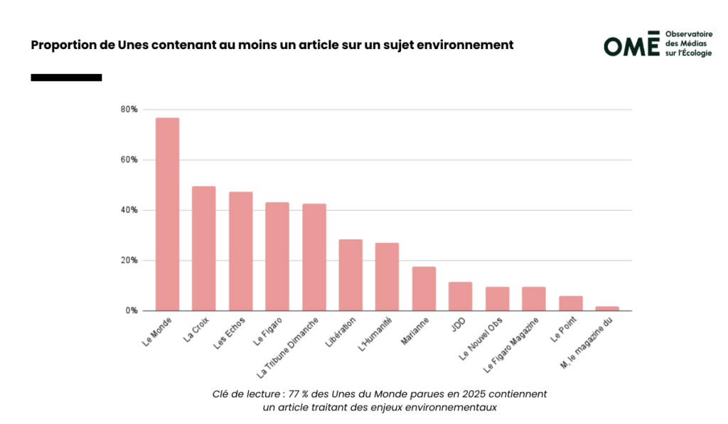 À l’inverse, Le Point, M Magazine et Le Figaro Magazine sont ceux qui leur ont accordé le moins de visibilité : moins de 10 % de leurs Unes contenaient un article sur l’environnement en 2025.