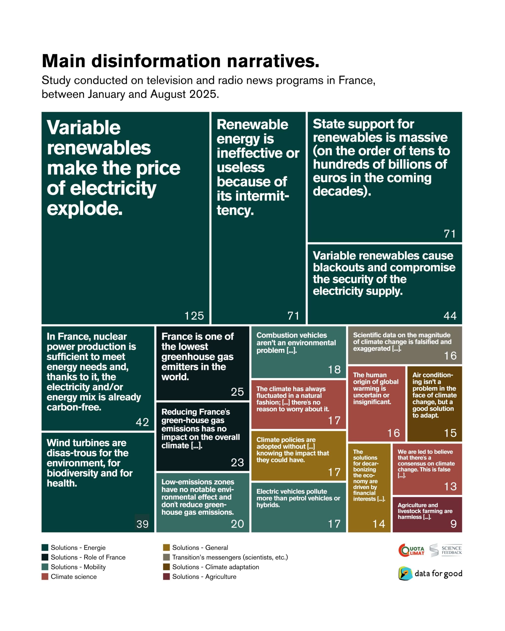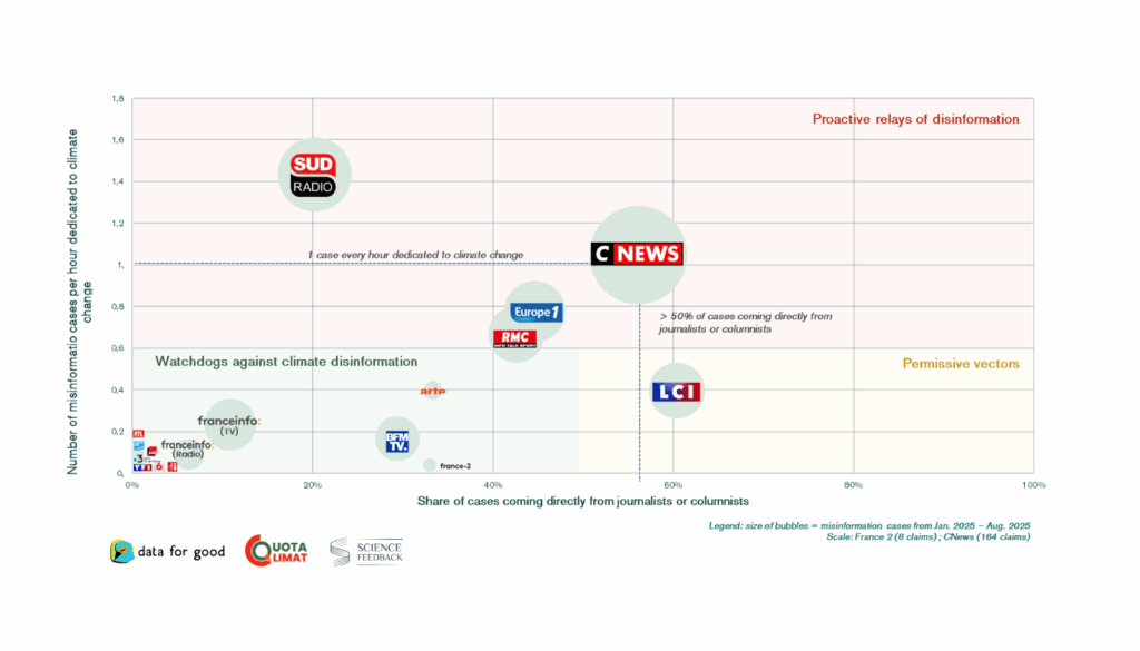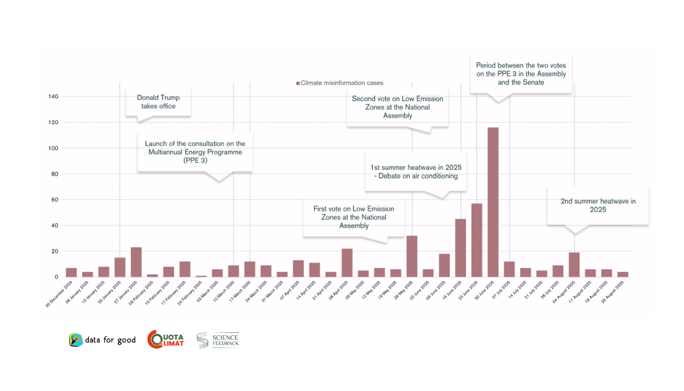 A few weeks before COP 30, the NGOs Data For Good, QuotaClimat and Science Feedback are releasing the findings of their new report mapping climate misinformation in audiovisual media. They warn that 529 cases have been detected in France over the past eight months. Without timely action from the media and policymakers, climate disinformation could continue to spread across mainstream outlets, where information integrity is supposedly protected.
